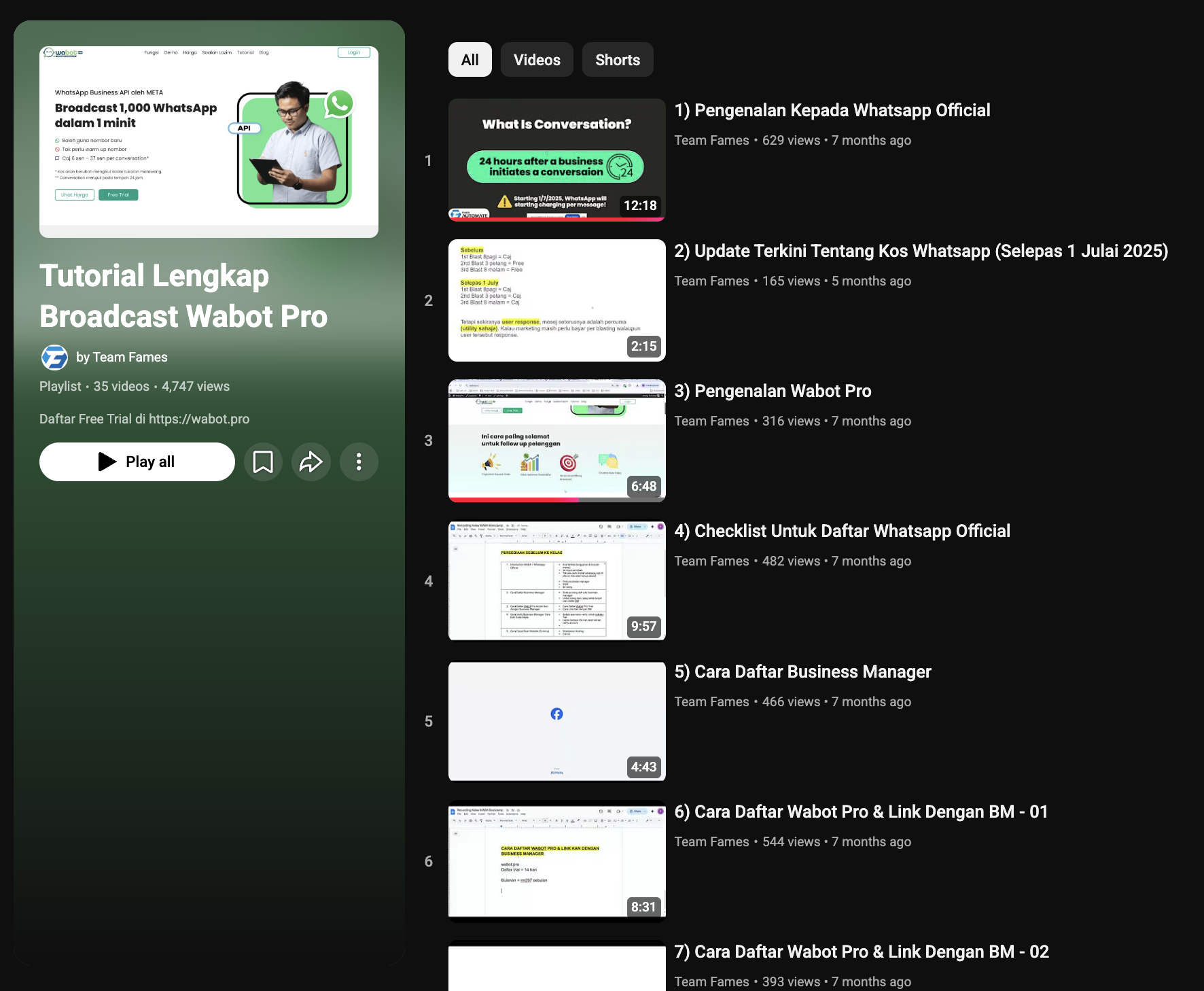 🎥 Video Tutorial Broadcast WhatsApp Official APIBelajar sendiri ikut kemampuan anda melalui panduan video tutorial lengkap Wabot Pro. Apa anda akan belajar?